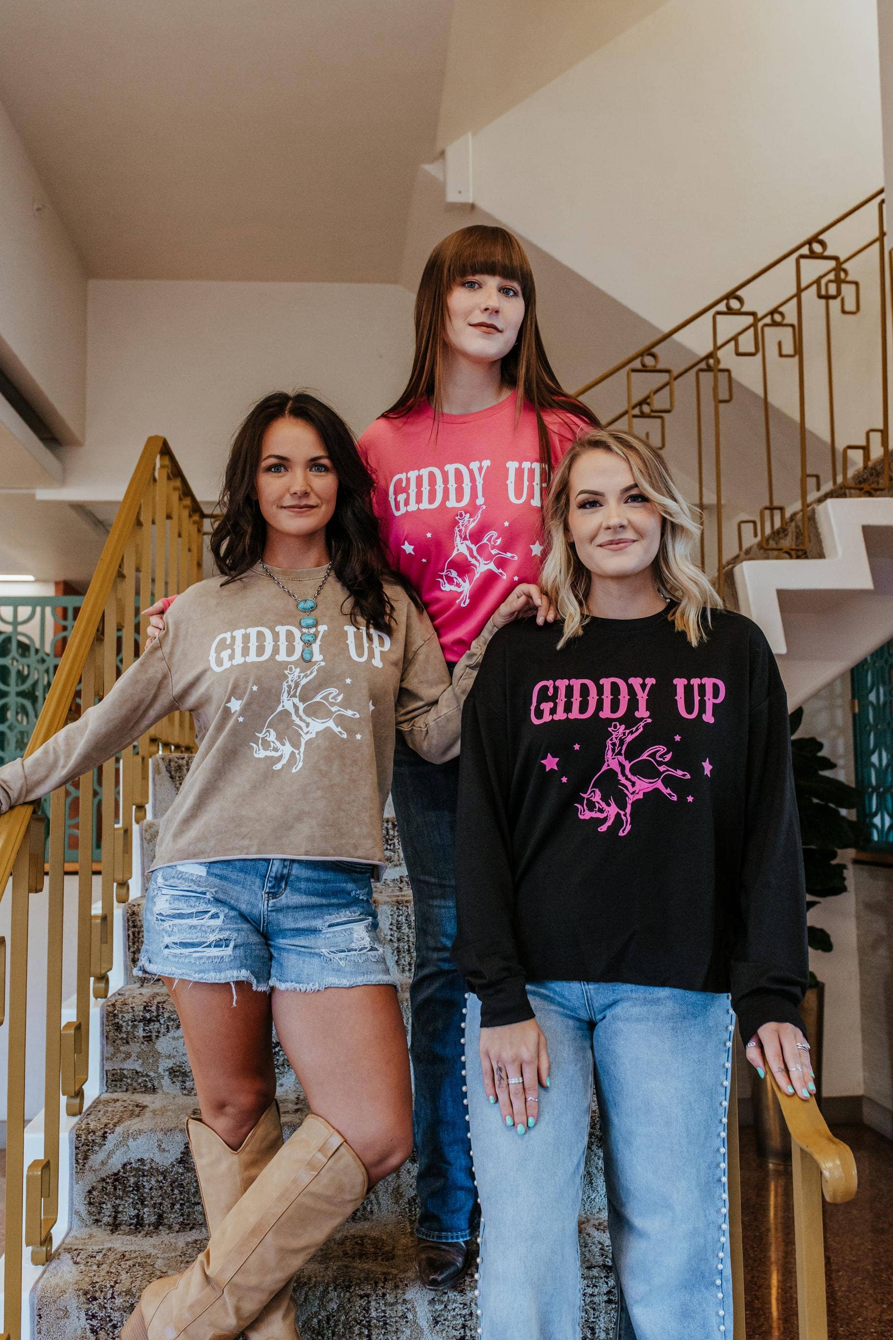 Fun and feminine, Giddy Up will do just that... get you out the door and on the road faster in a super cute western theme top for a no fuss fit! This buttery soft long sleeve tee features raw bottom hem, cuffed sleeve, crew neck, and bubble gum pink flocked design. Paired with your favorite jeans, it's always a hit!