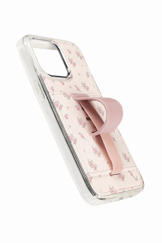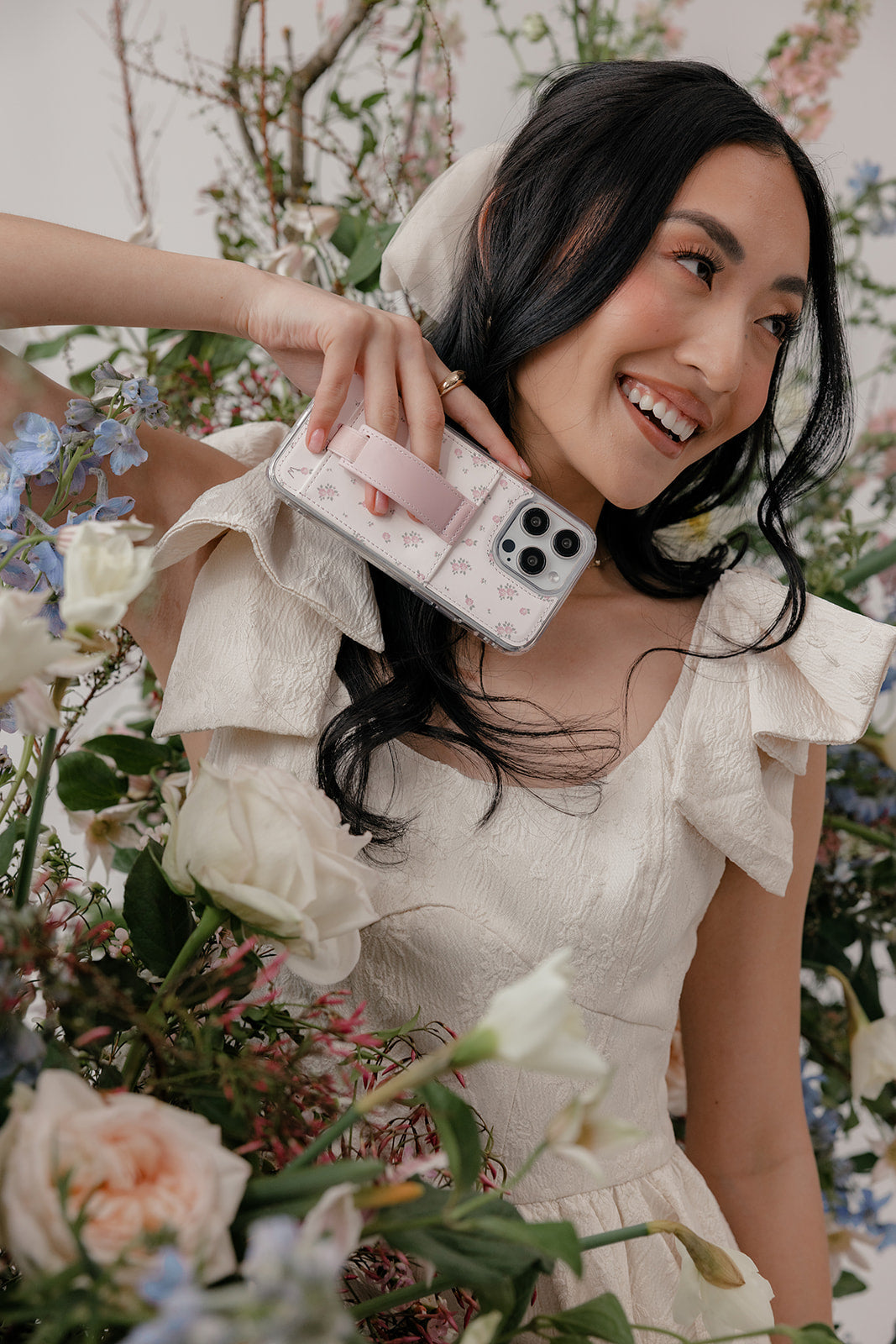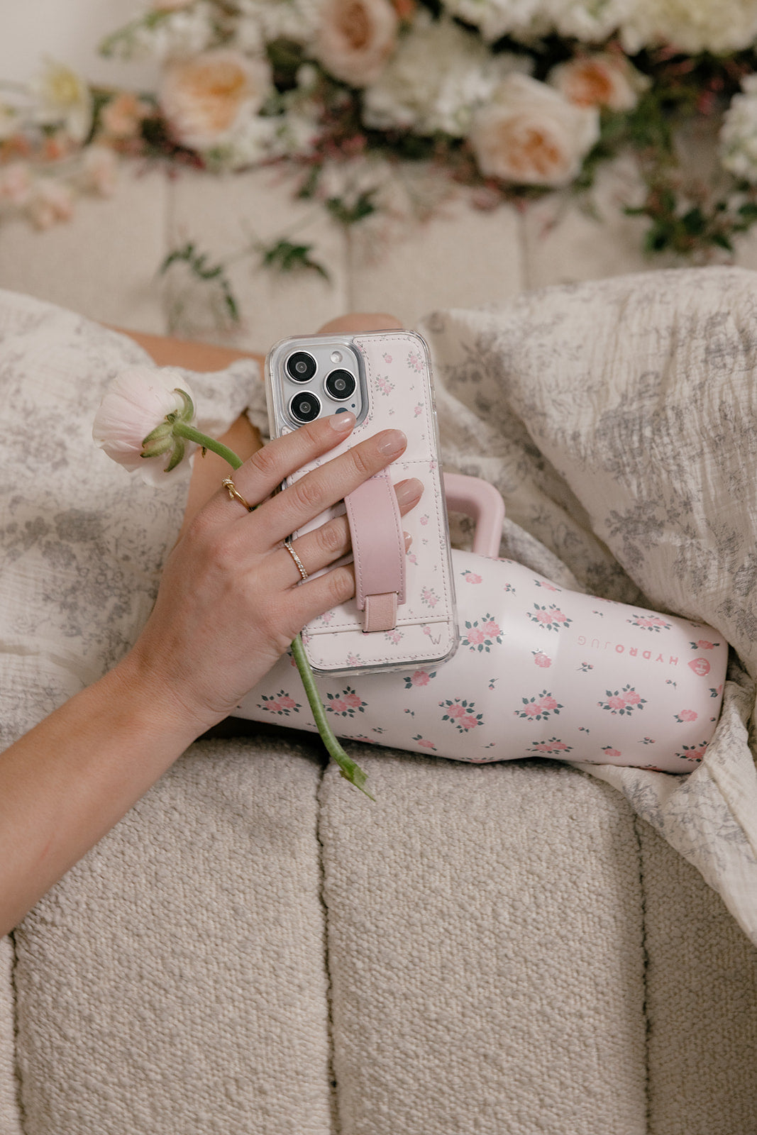 Case Design: Pink rosettes on a light pink background with a solid pink strap.