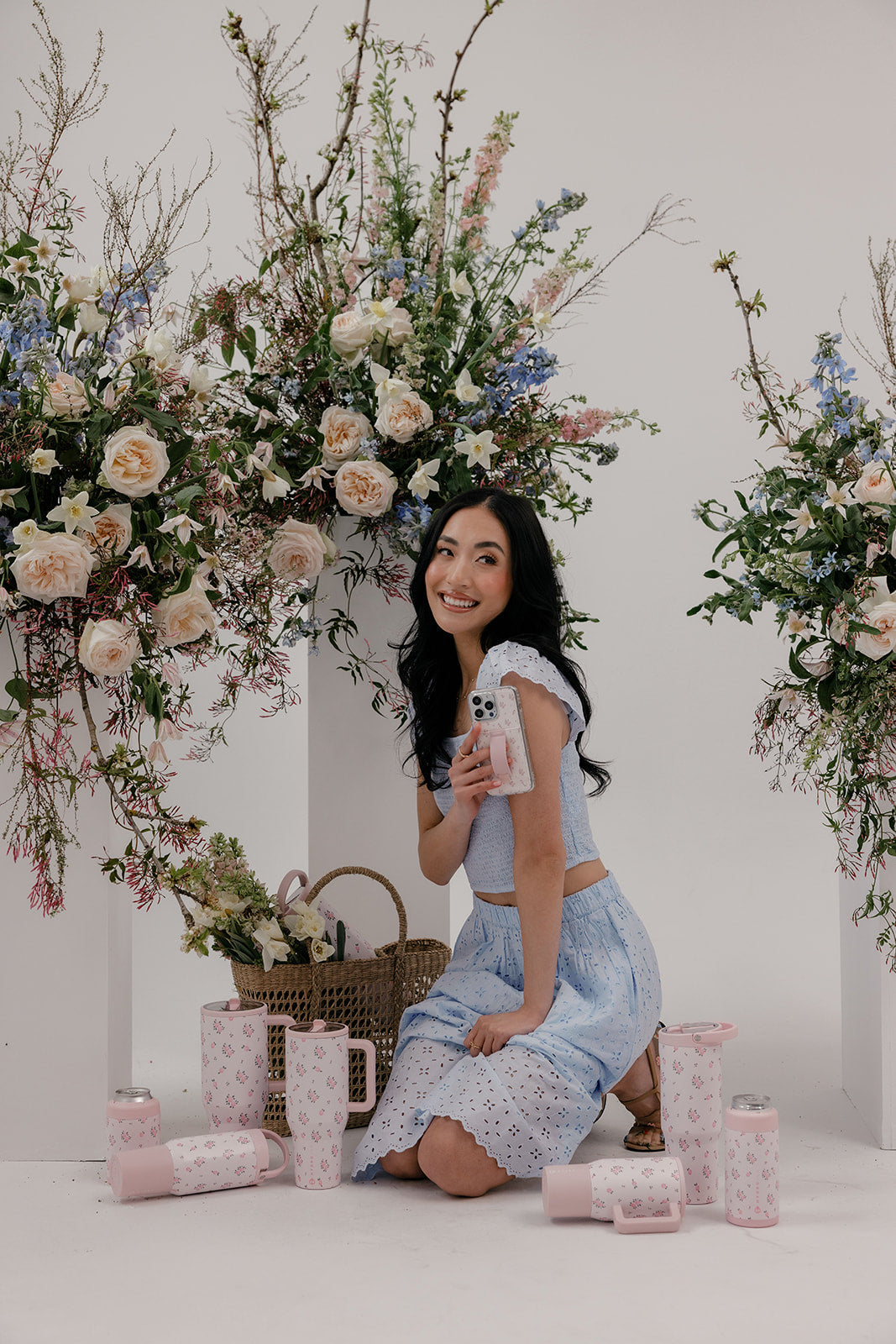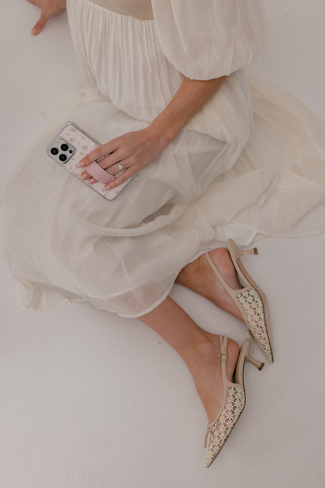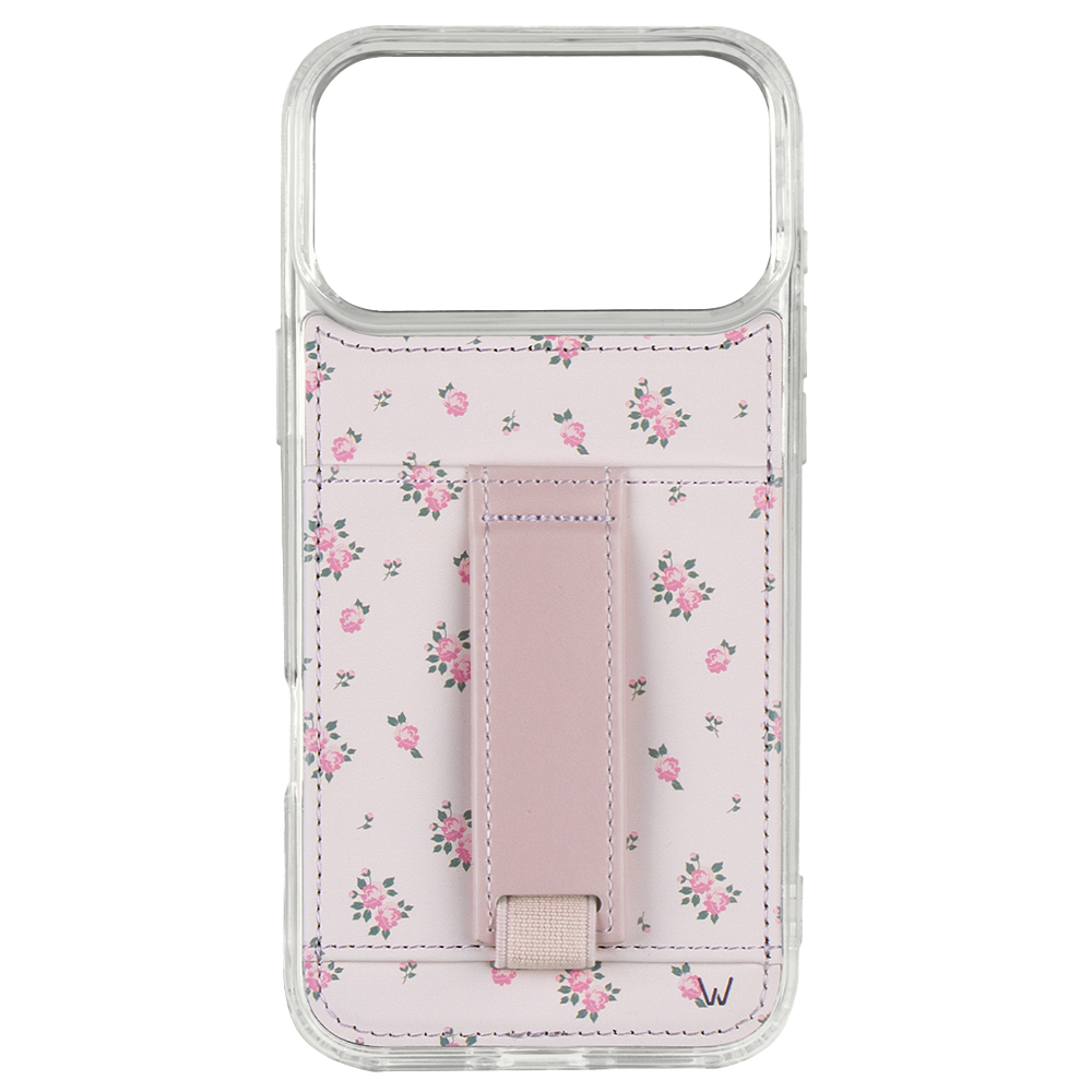 Case Design: Pink rosettes on a light pink background with a solid pink strap.